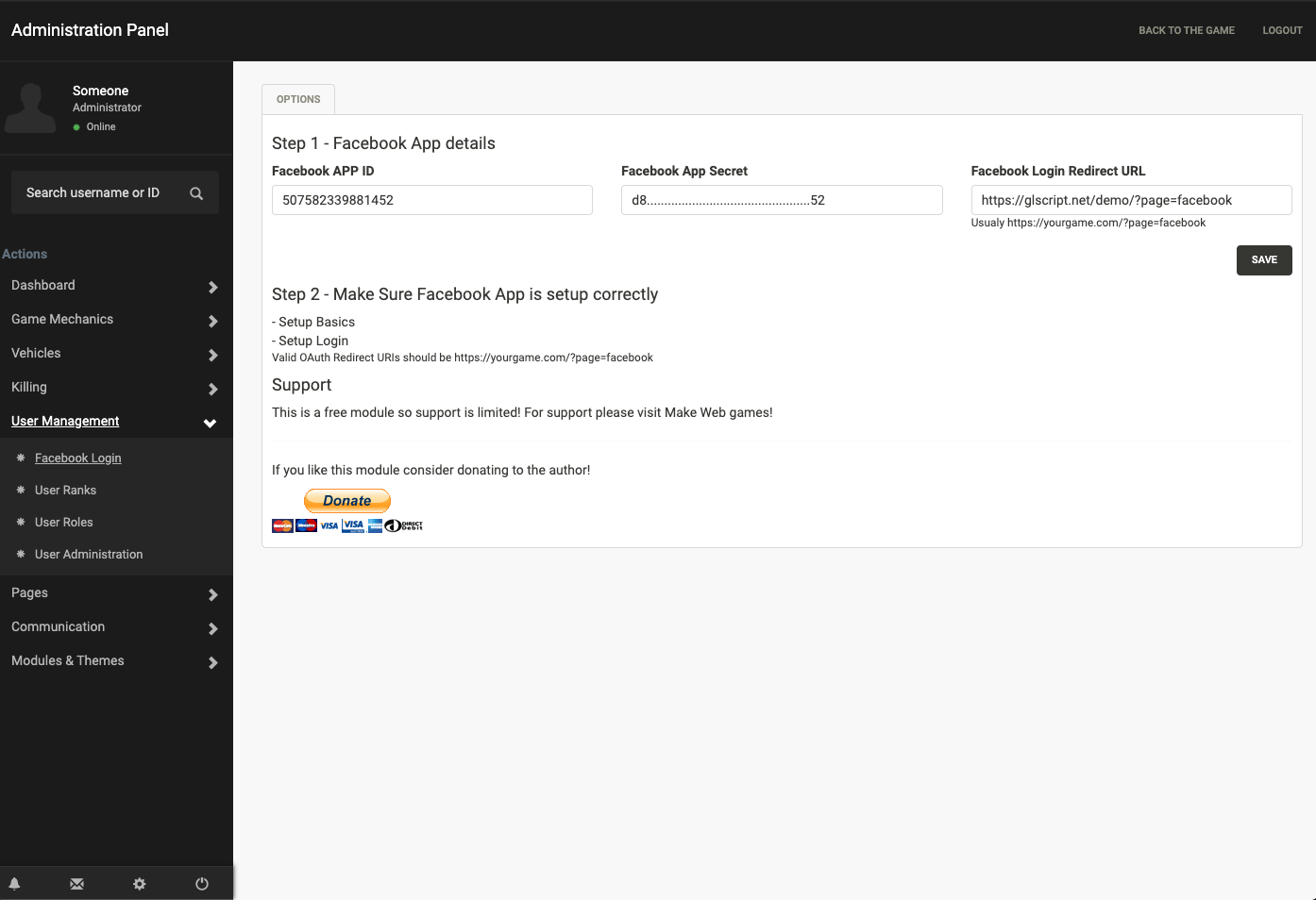 Ever wanted the ability to log into your game via facebook? If so this mod allows you and your users to do that!