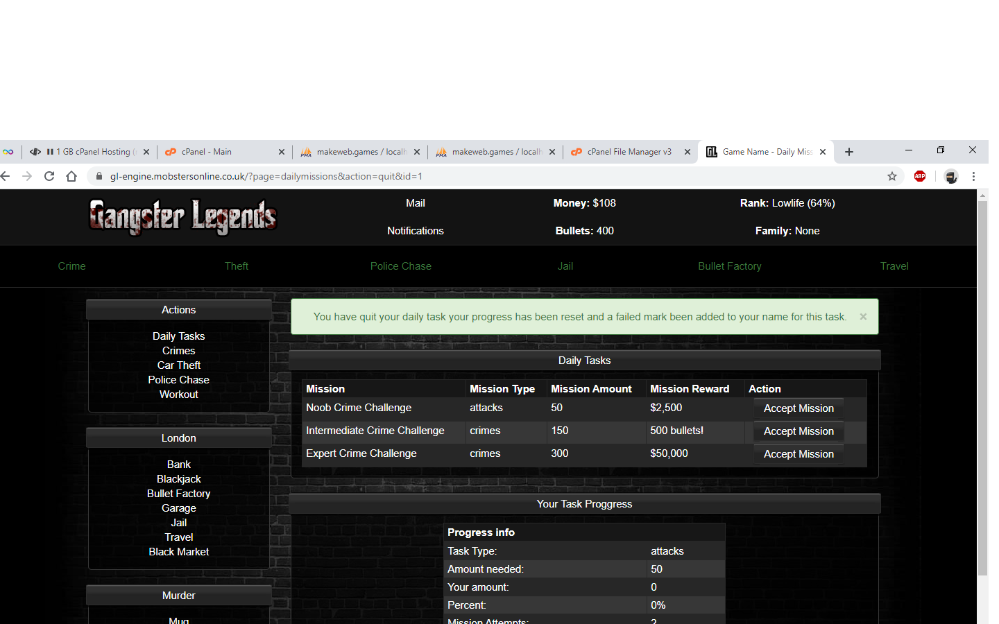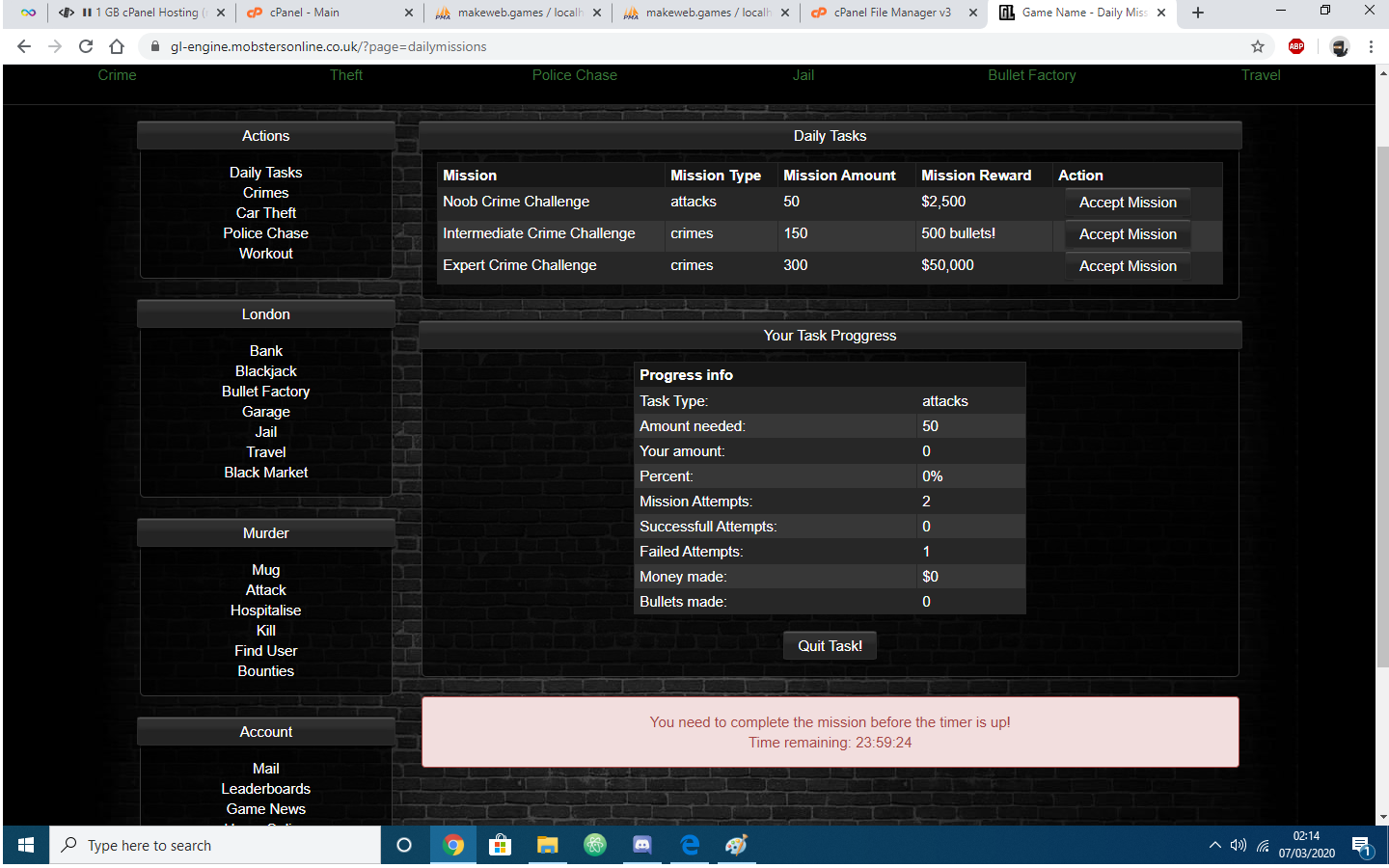 Users can set up a task and they get 24 hours to complete it if they don't then they get a failed mark on there record for that task it will track how many times you do the task pass the task fail the task gain money from the task and bullets from the task.