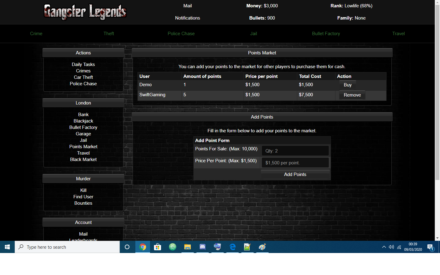 With this module installed in your game your users will be able to add points to the market and other users will be able to purchase them for cash.
