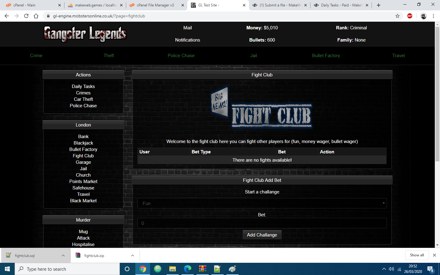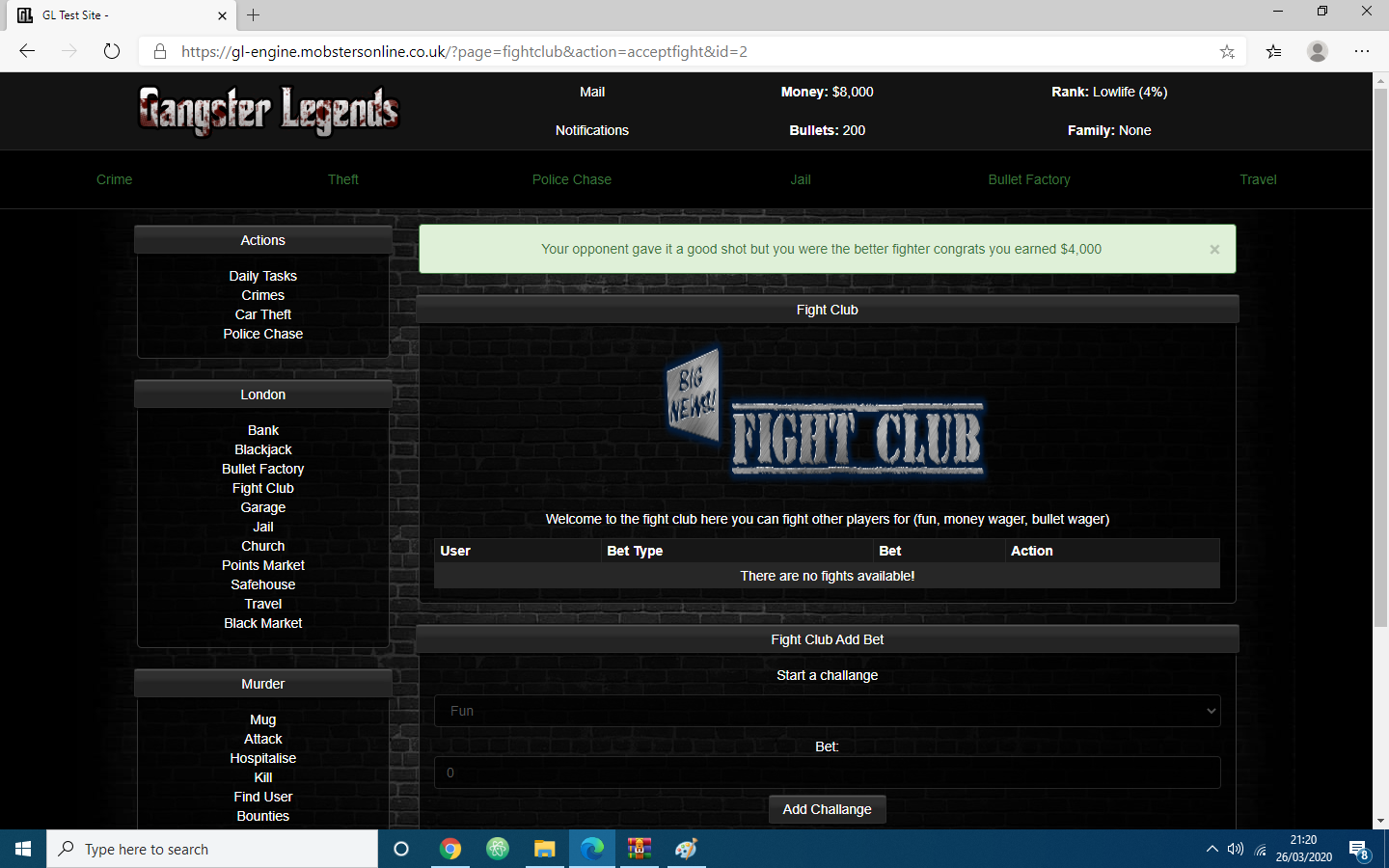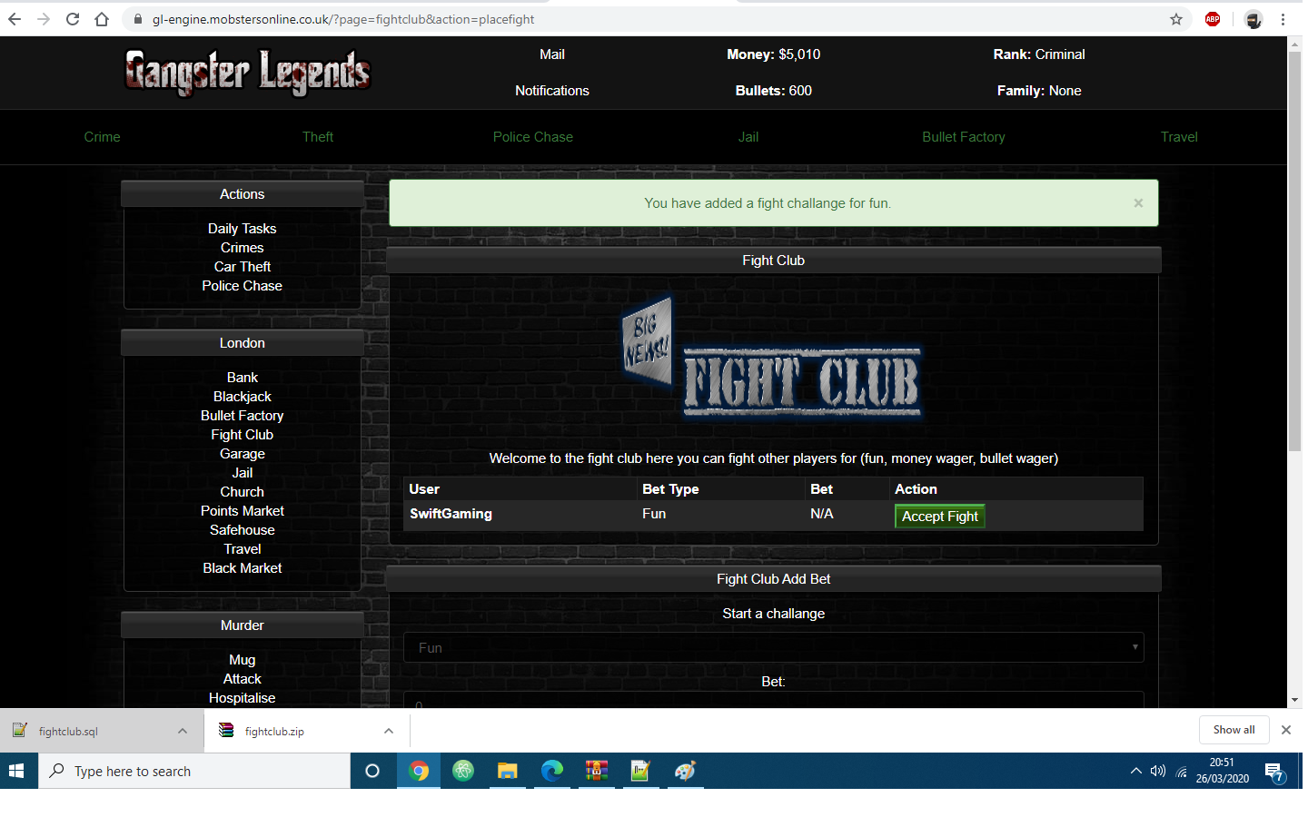 This module when installed on your game your users will be able to start their own fight club challenges for rewards.
