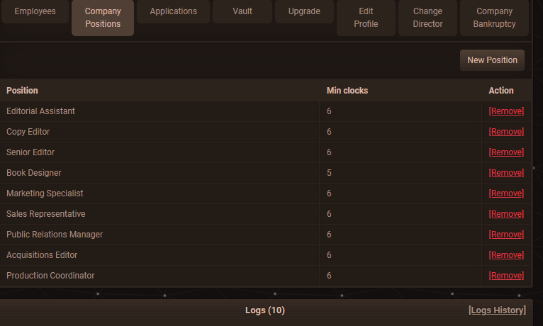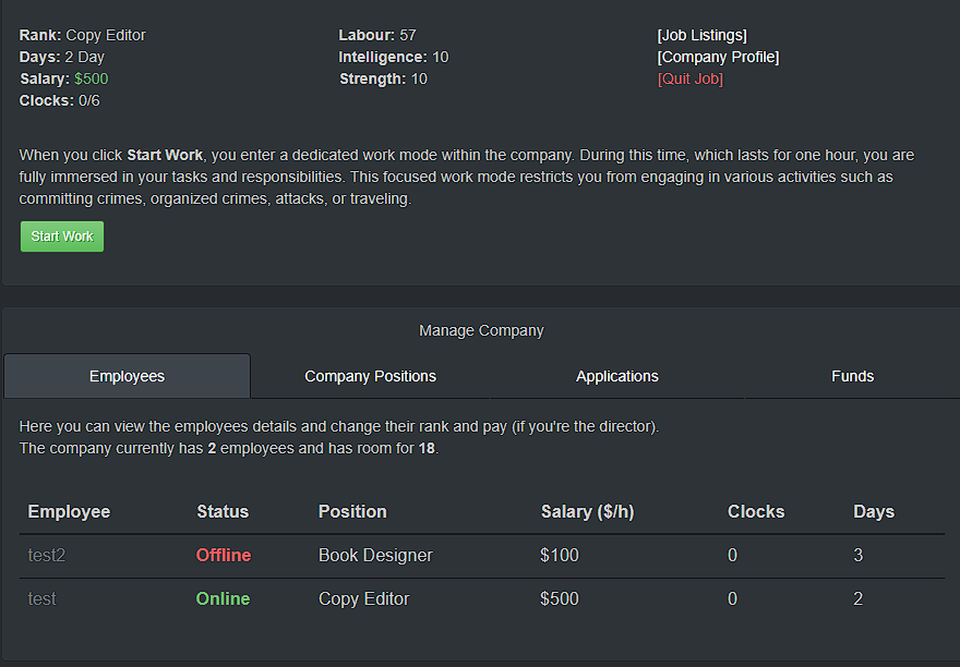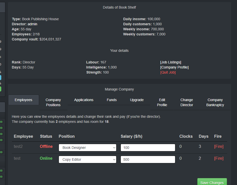 The Companies module lets players experience the thrill of running and working in dynamic, player-driven businesses. Players can create and manage companies, hire other players as workers, set custom job positions, define minimum working hours (clocks).