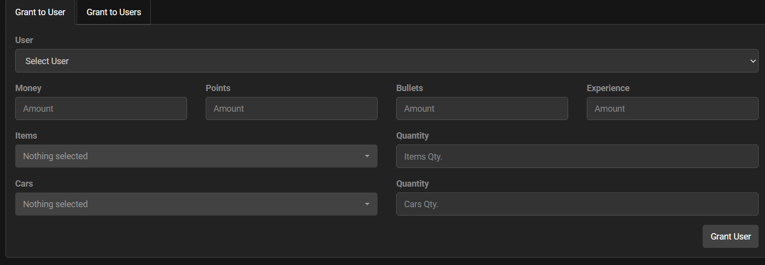 Enhance your game with a robust grants system—perfect for rewarding users with money, points, items, cars, and more! Fully integrated with GLv2 for a seamless, powerful admin experience.