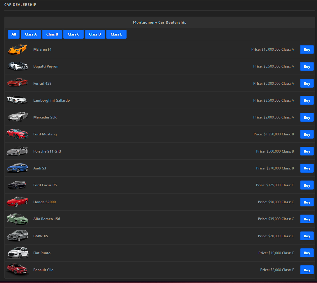 Enhance your racing game with this Car Dealership module! This add-on allows players to browse, buy cars, and admins to manage cars in a dedicated locations