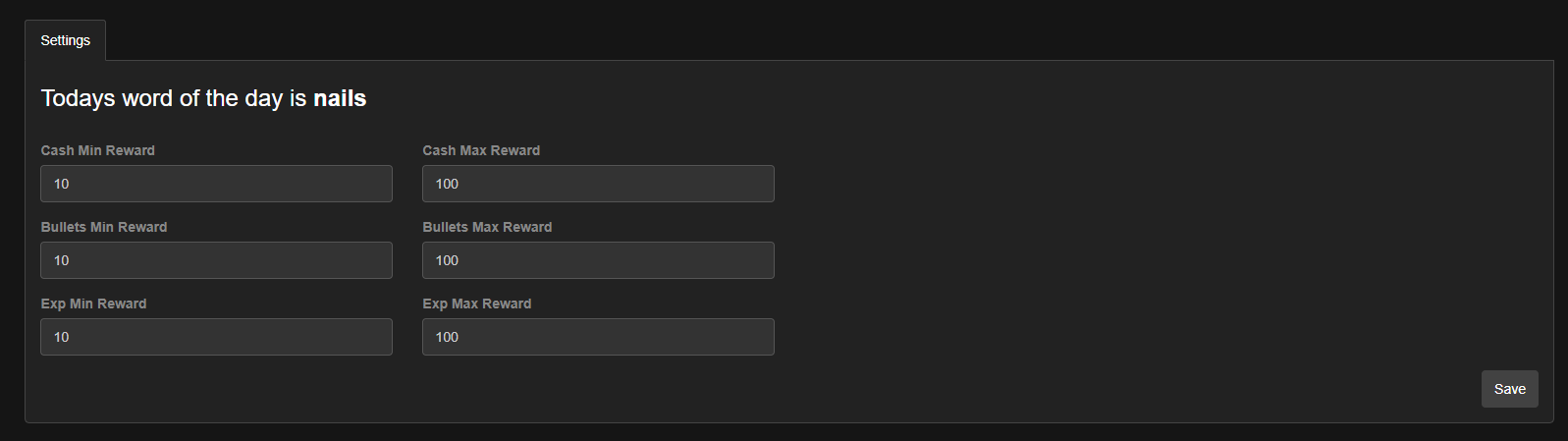 Word of the Day is a daily word-guessing game where players have 6 attempts to crack the secret 5-letter word, which resets at midnight. After each guess, players receive color-coded feedback indicating whether each letter is correct, present, or absent. A successful guess rewards them with Cash, Bullets, and EXP — all configurable through the admin control panel.