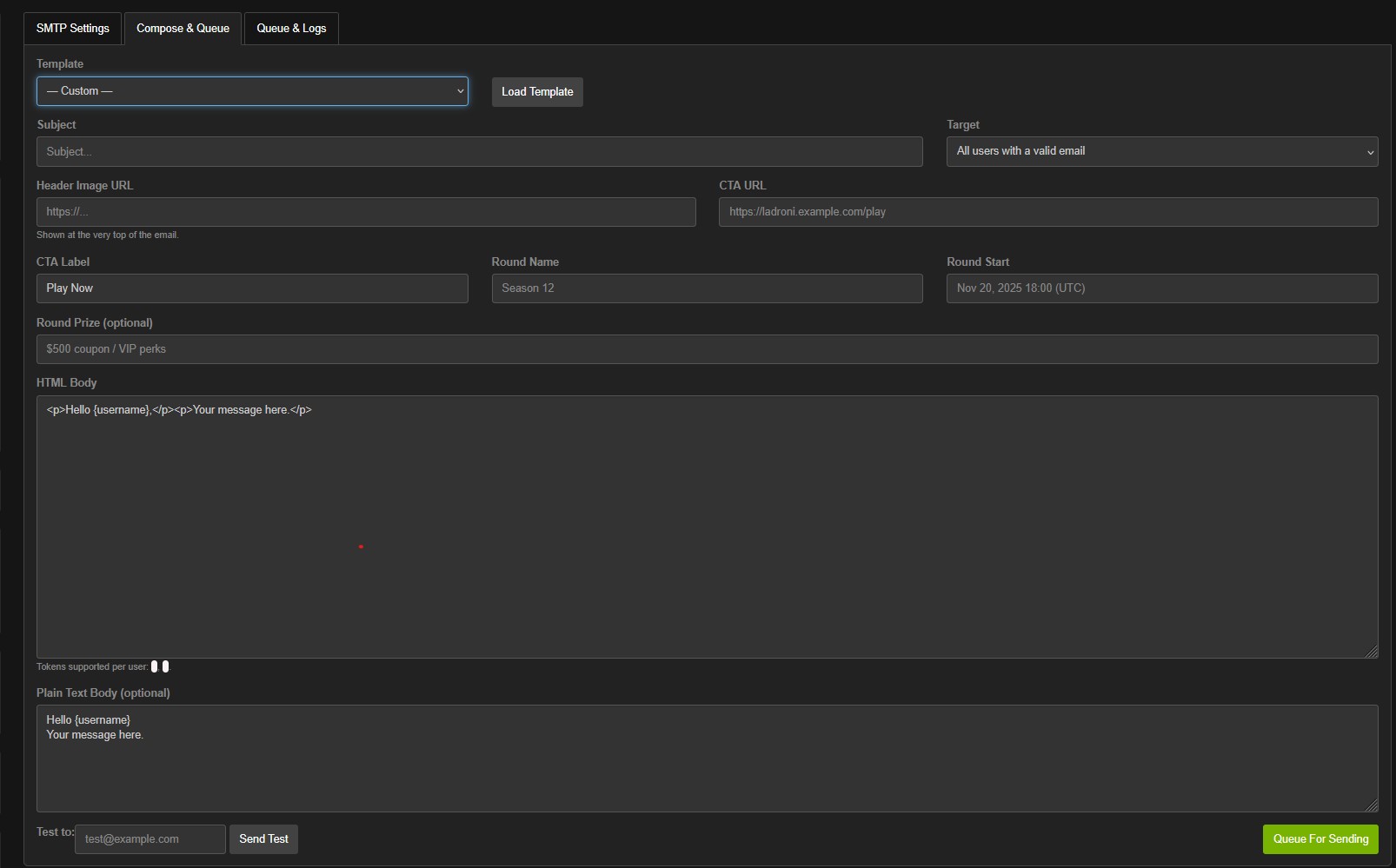A lightweight, production-ready admin module that lets you send beautiful, personalized emails to your players—using Gmail SMTP (App Password)—without external libraries. Includes queueing, logs, one-click “Send Now”, cron support, reusable templates, and per-user tokens.