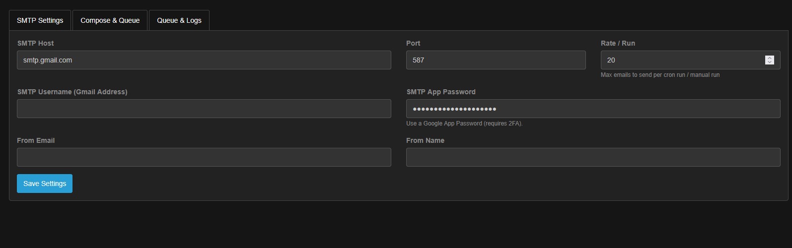 Queue & Logs: Compose → Queue → Send via cron or “Send Now”. View status (queued/sent/failed), attempts, timestamps, and last error.