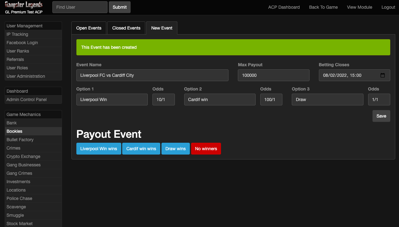 This allows you to make events in the ACP that users can bet on, this is good for things like football at the weekends