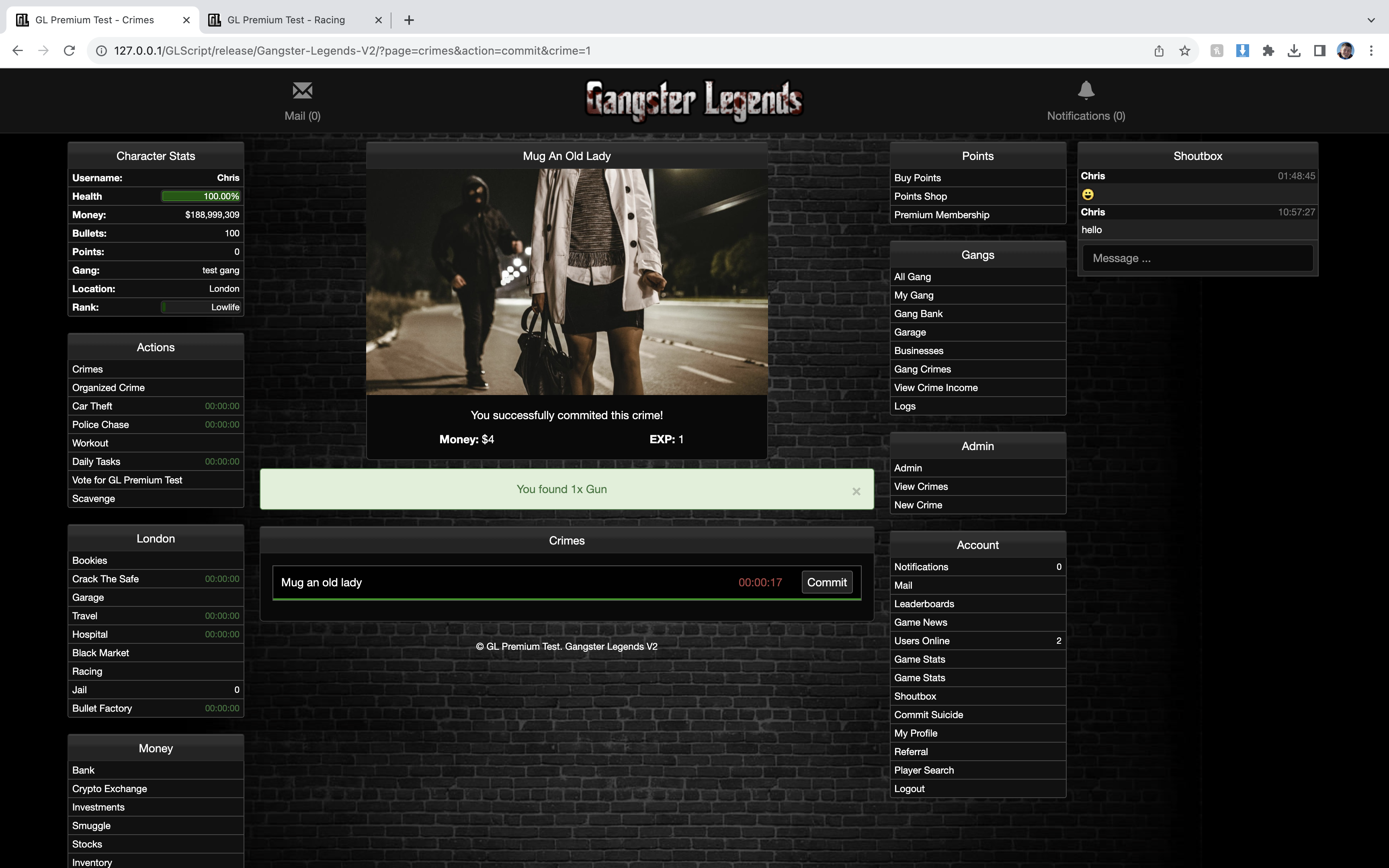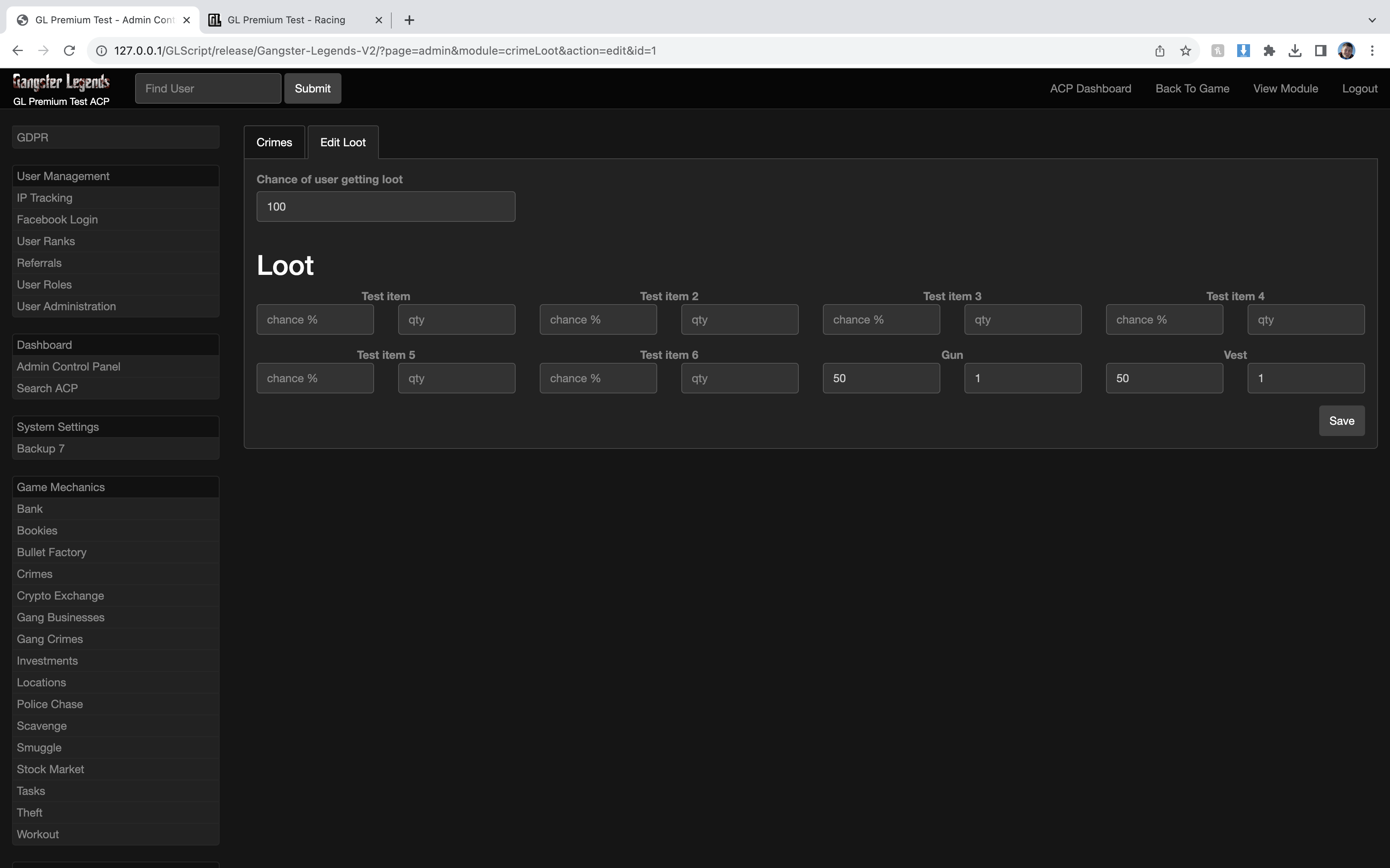 This module allows you to add loot drops to your crime actions, this can be installed with any variant of crime module and will work as long as your crime module uses the userAction crime hook.