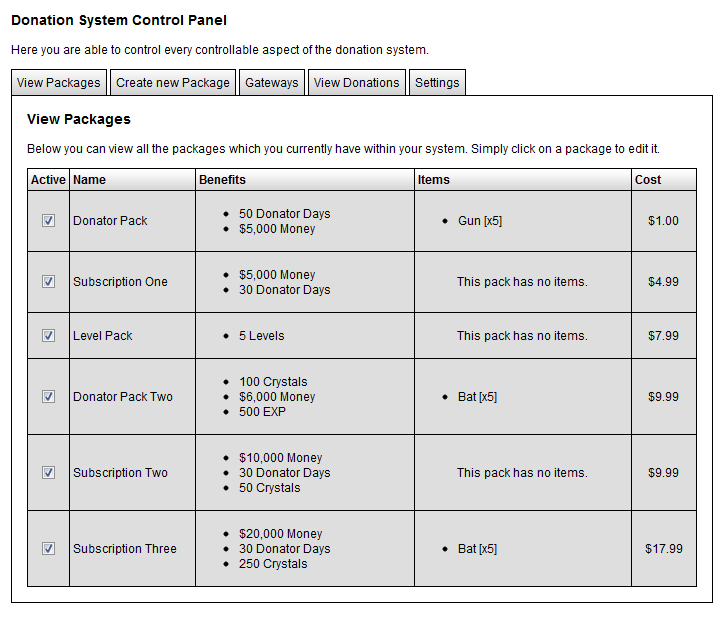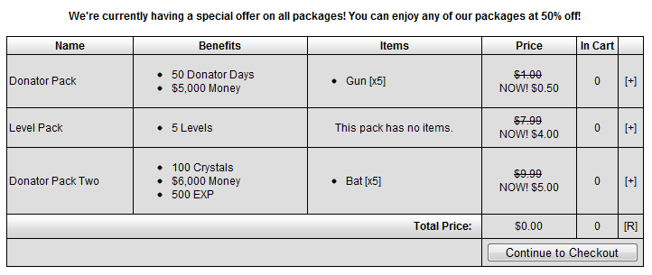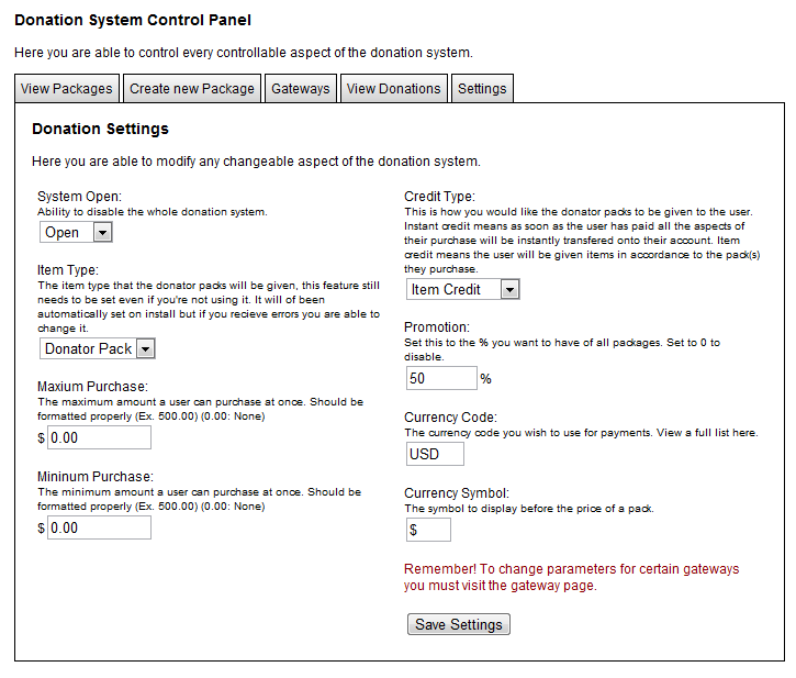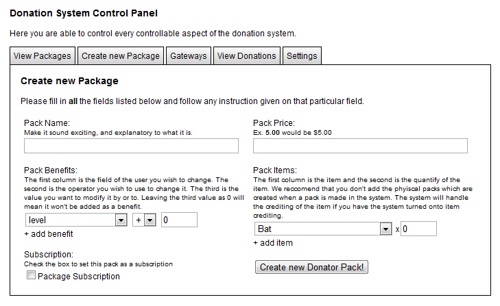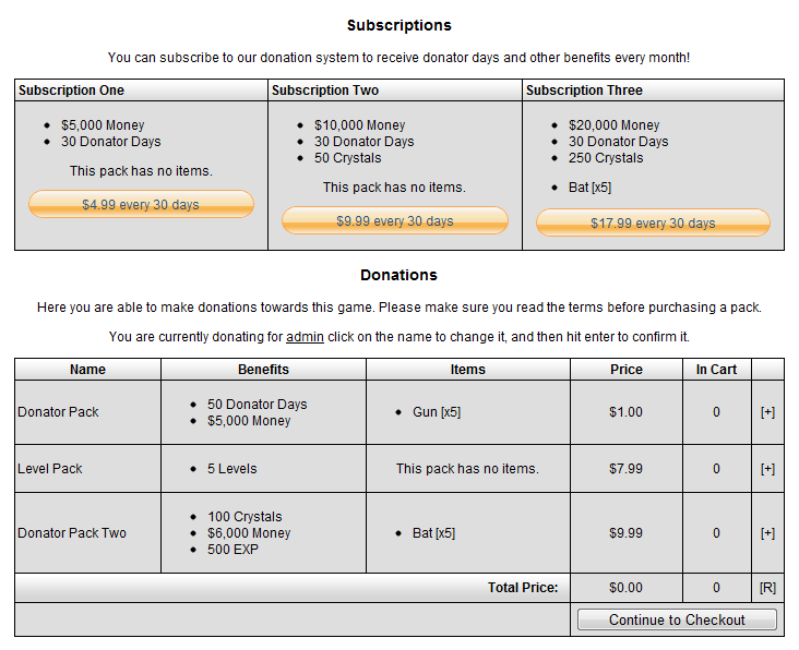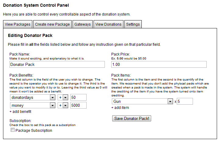 - Credit Type - You can set your system on Instant Credit so the user instantly receive the pack or set it to Item Credit so the user receives the donator pack as an item in their inventory.