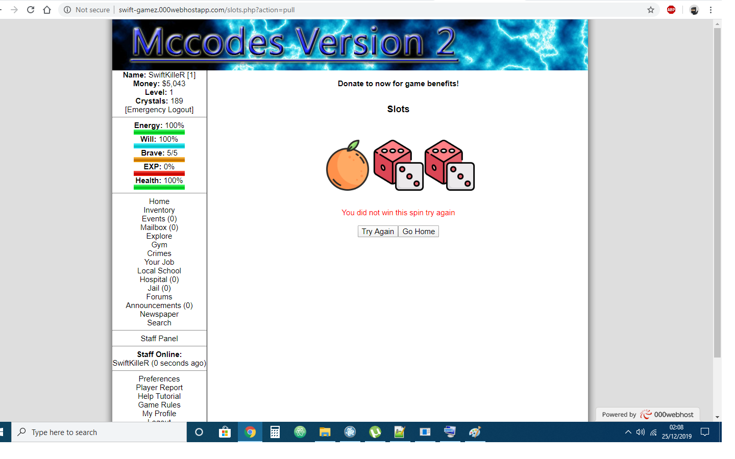Slot machine where users can spend there crystals to have a chance at winning Money, Crystals, Items.