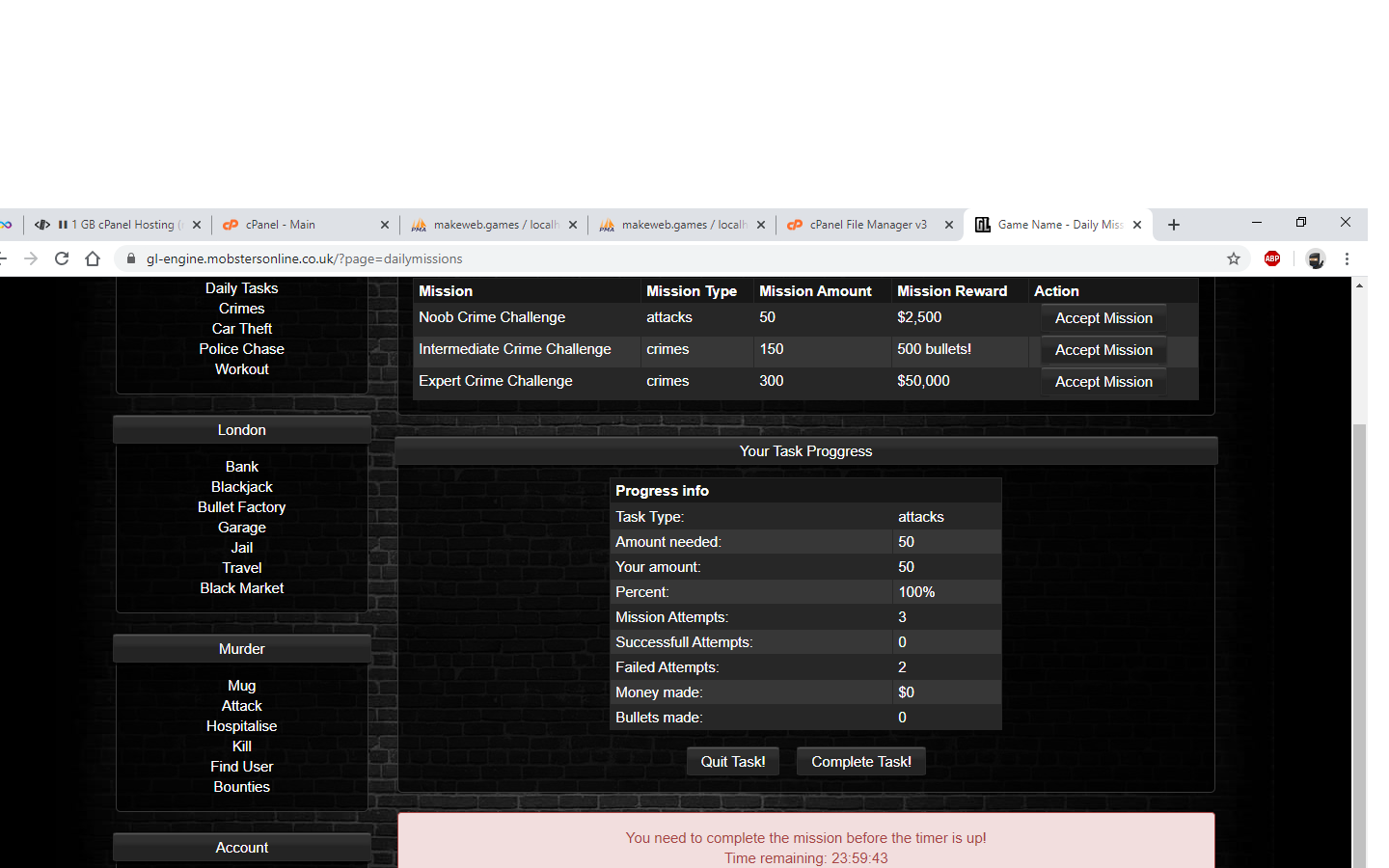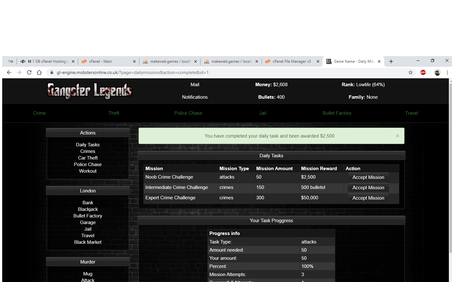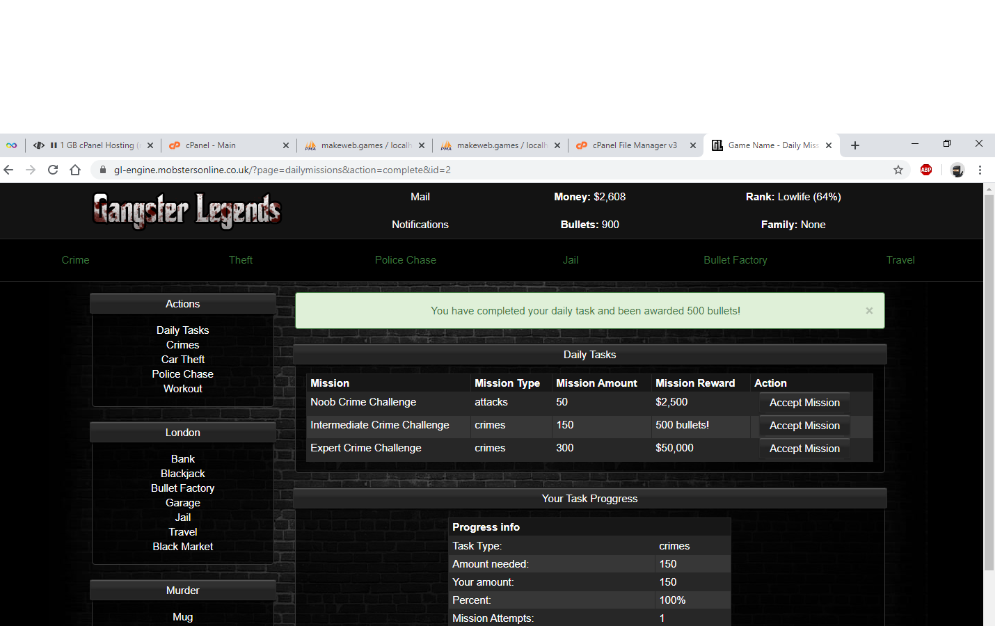 Users can set up a task and they get 24 hours to complete it if they don't then they get a failed mark on there record for that task it will track how many times you do the task pass the task fail the task gain money from the task and bullets from the task.
