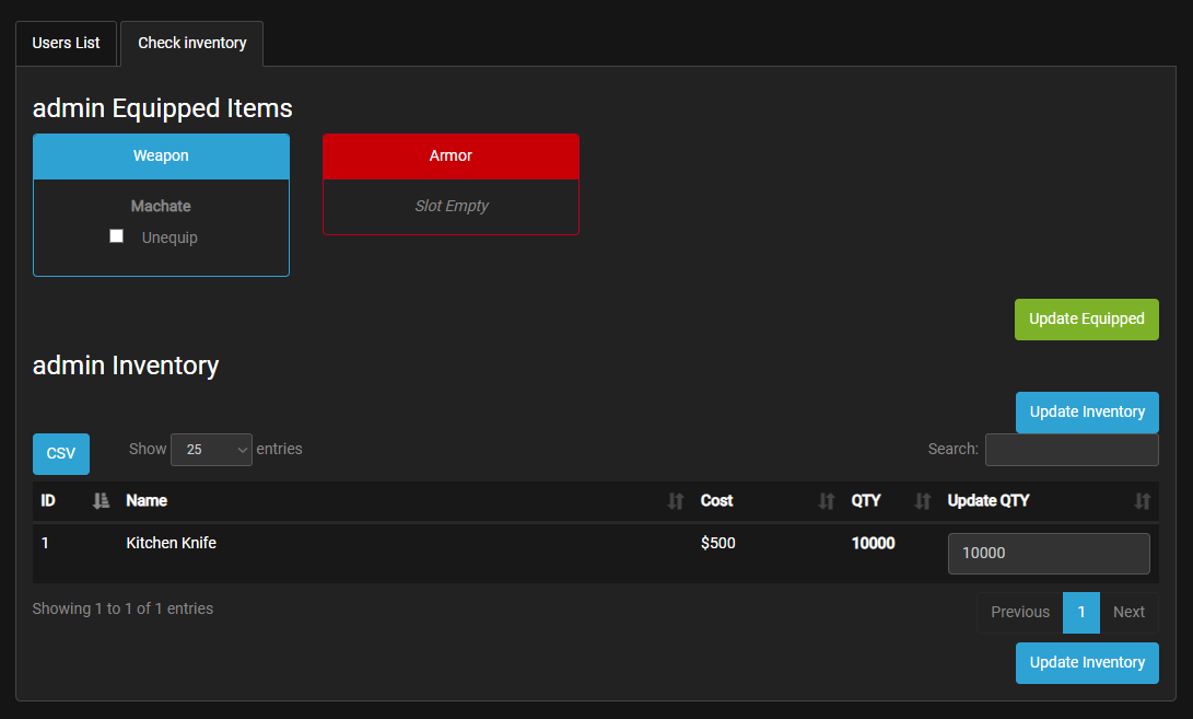 This mod allow you to view, Update, give items, unequip slots from your game users.