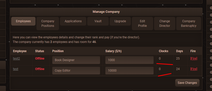 The Companies module lets players experience the thrill of running and working in dynamic, player-driven businesses. Players can create and manage companies, hire other players as workers, set custom job positions, define minimum working hours (clocks).