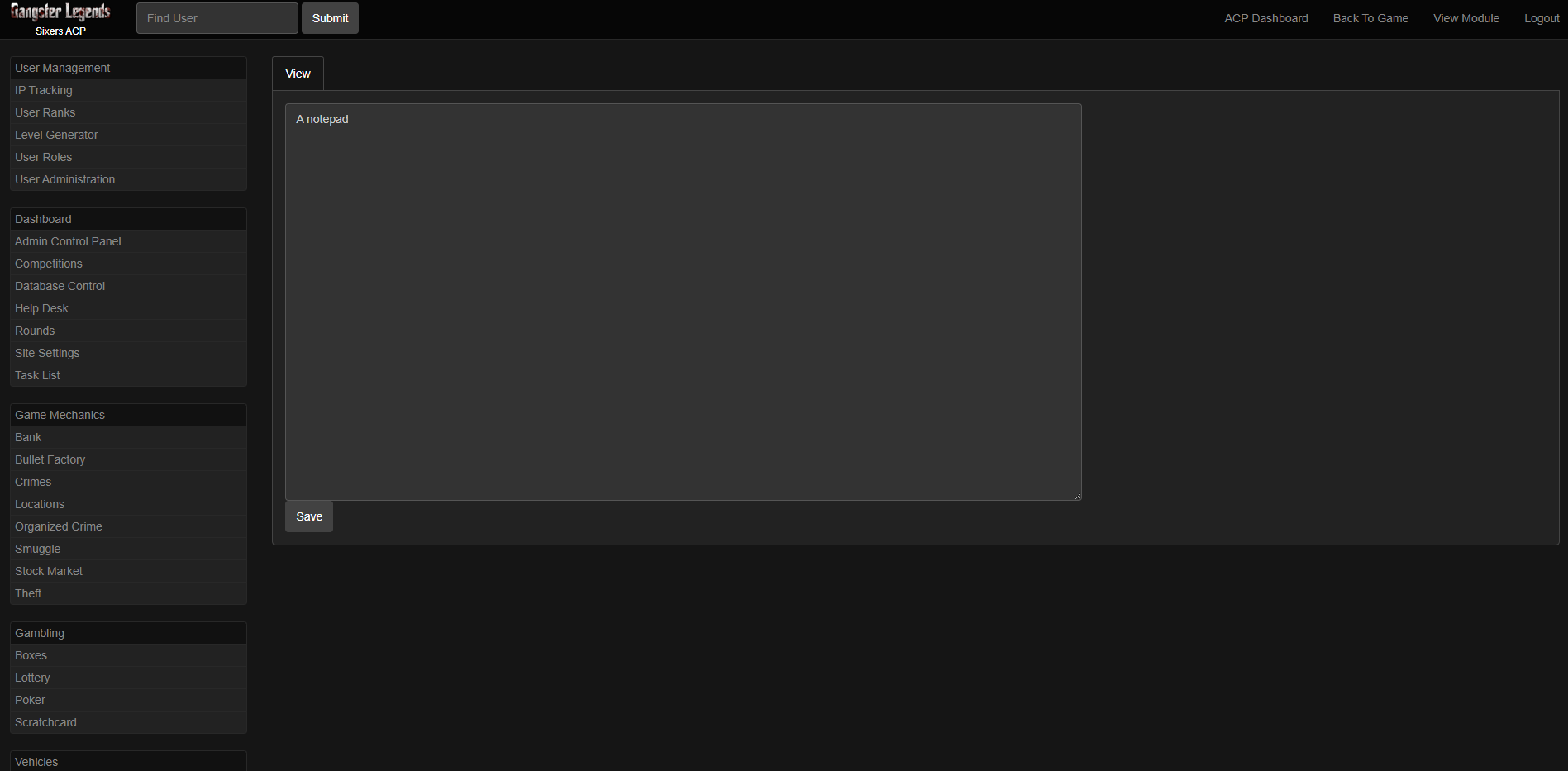 [] Front-end notepad for all players, accessible from sidebar [] Notes are stored per-user in the database [] Simple edit + save functionality [] Admin Control Panel view to browse and read player notes [] Bootstrap styled theme compatibility [] No external dependencies — plug and play