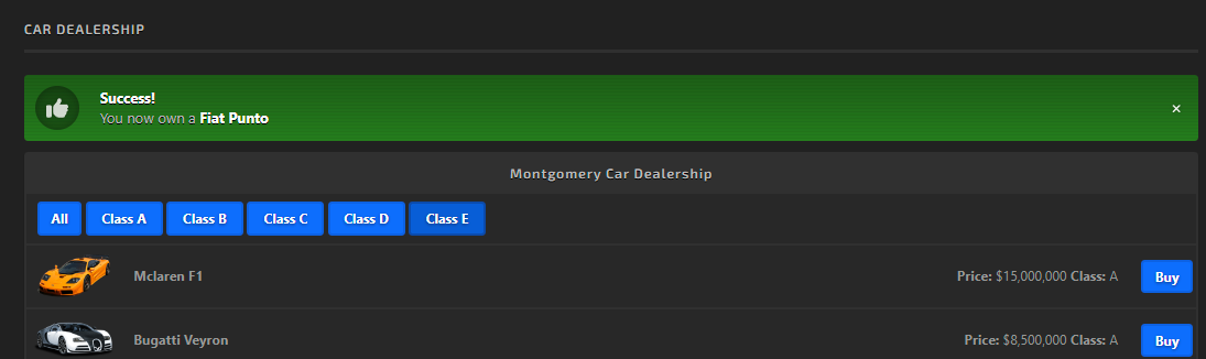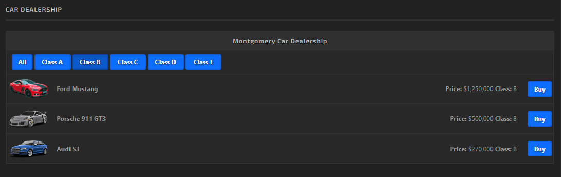 Enhance your racing game with this Car Dealership module! This add-on allows players to browse, buy cars, and admins to manage cars in a dedicated locations