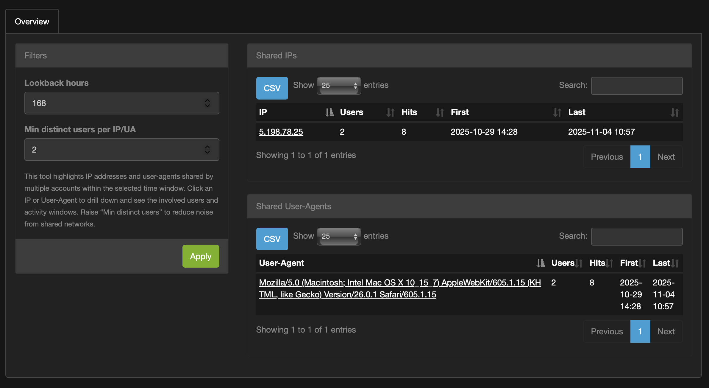 The Multi Account Detector module is designed to help administrators identify and manage users who may be operating multiple accounts on the same browser or network. It works by automatically logging key connection data — such as IP addresses and browser sessions — each time a user logs in or performs certain actions.