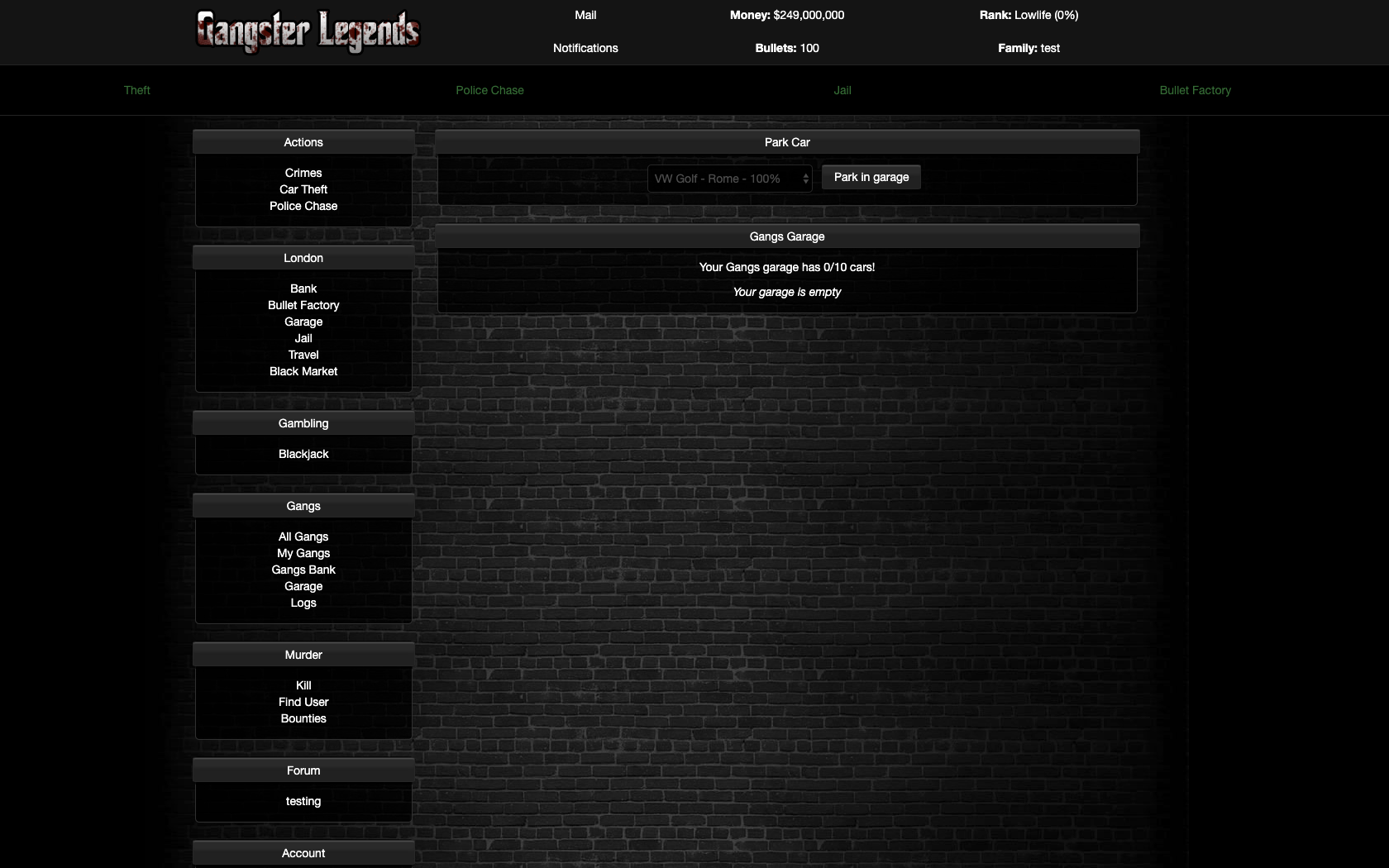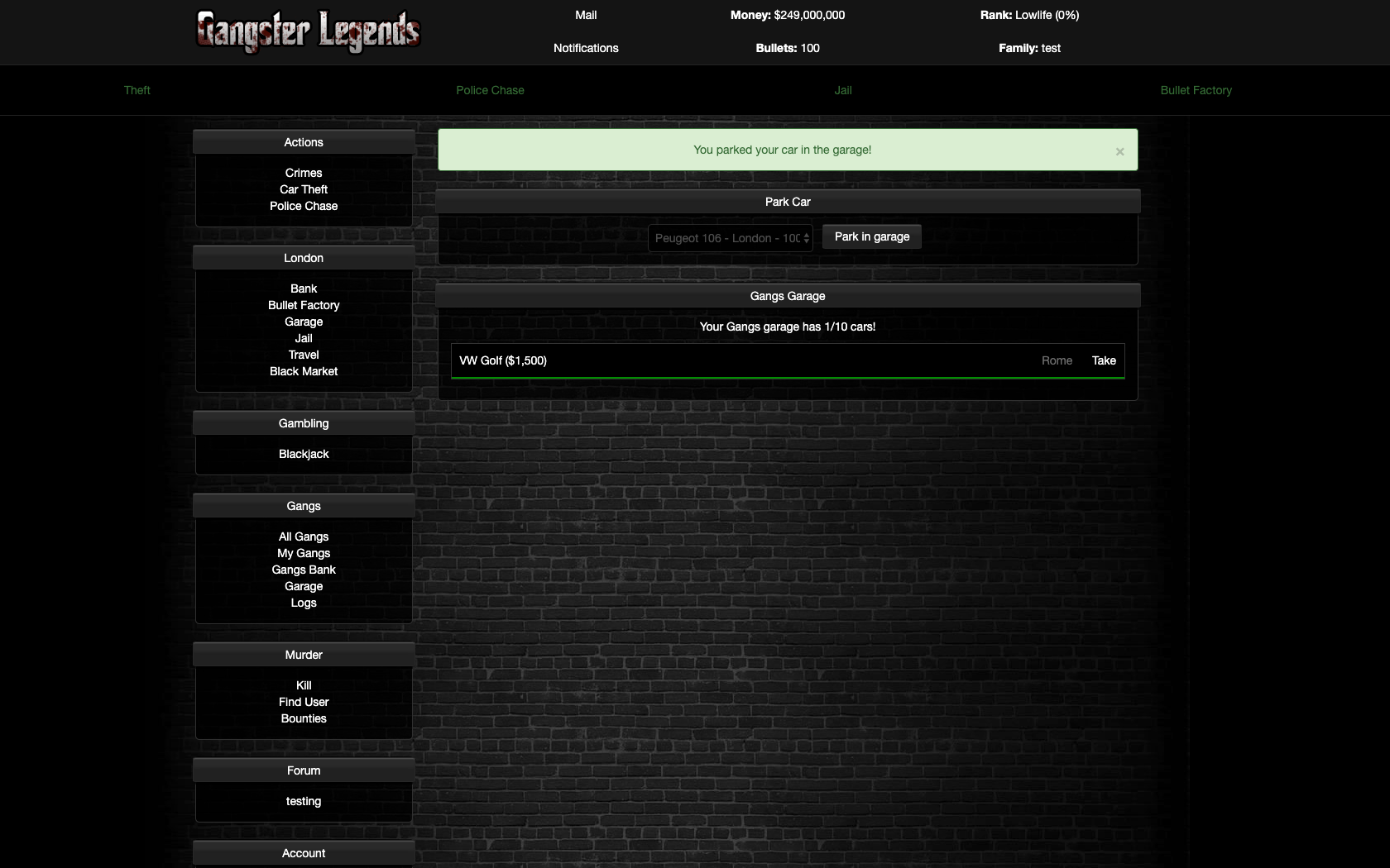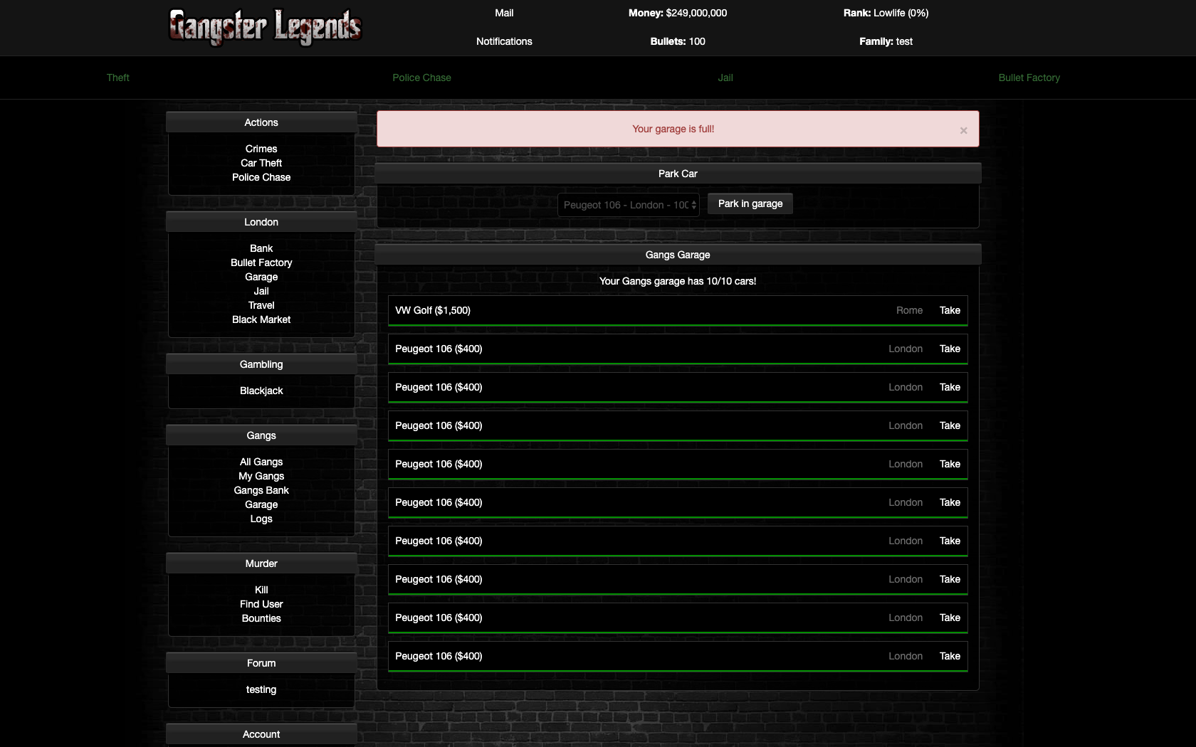 • The garage has a limited number of spaces (Gang Level x 5 + 5) i.e. level 1 gang = 10 spaces level 5 = 30 spaces