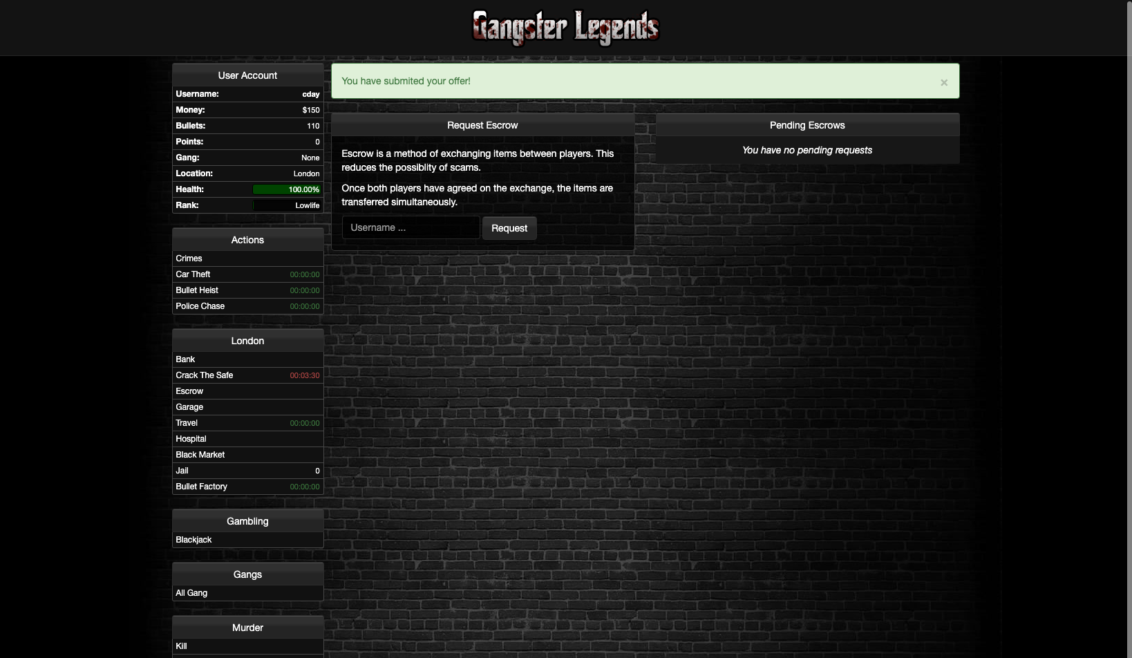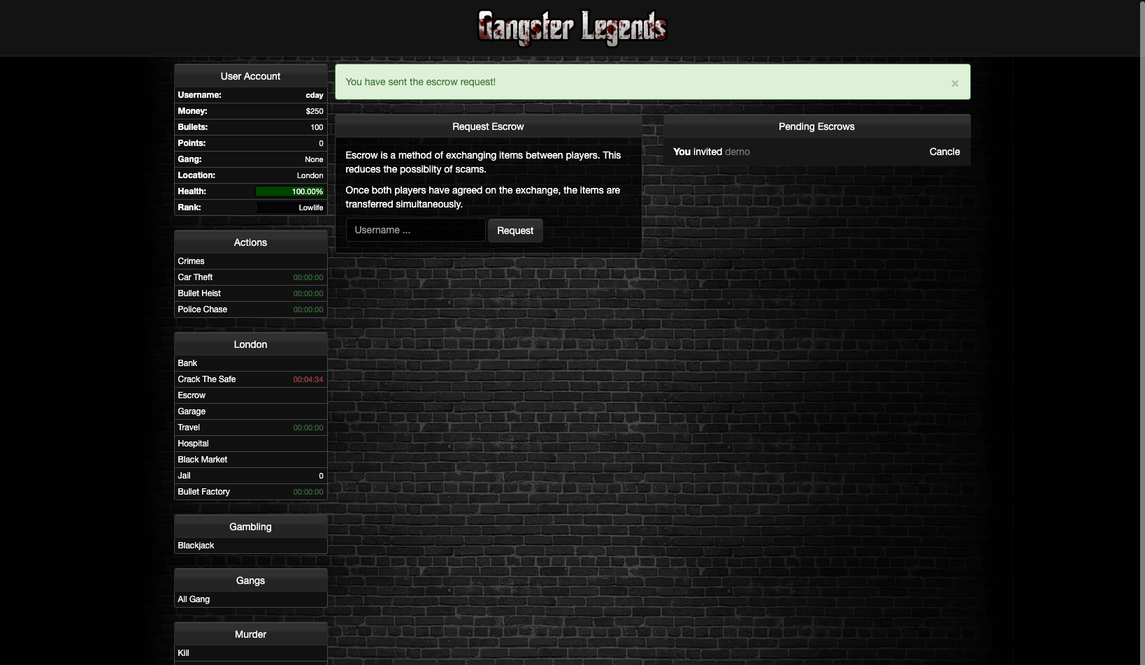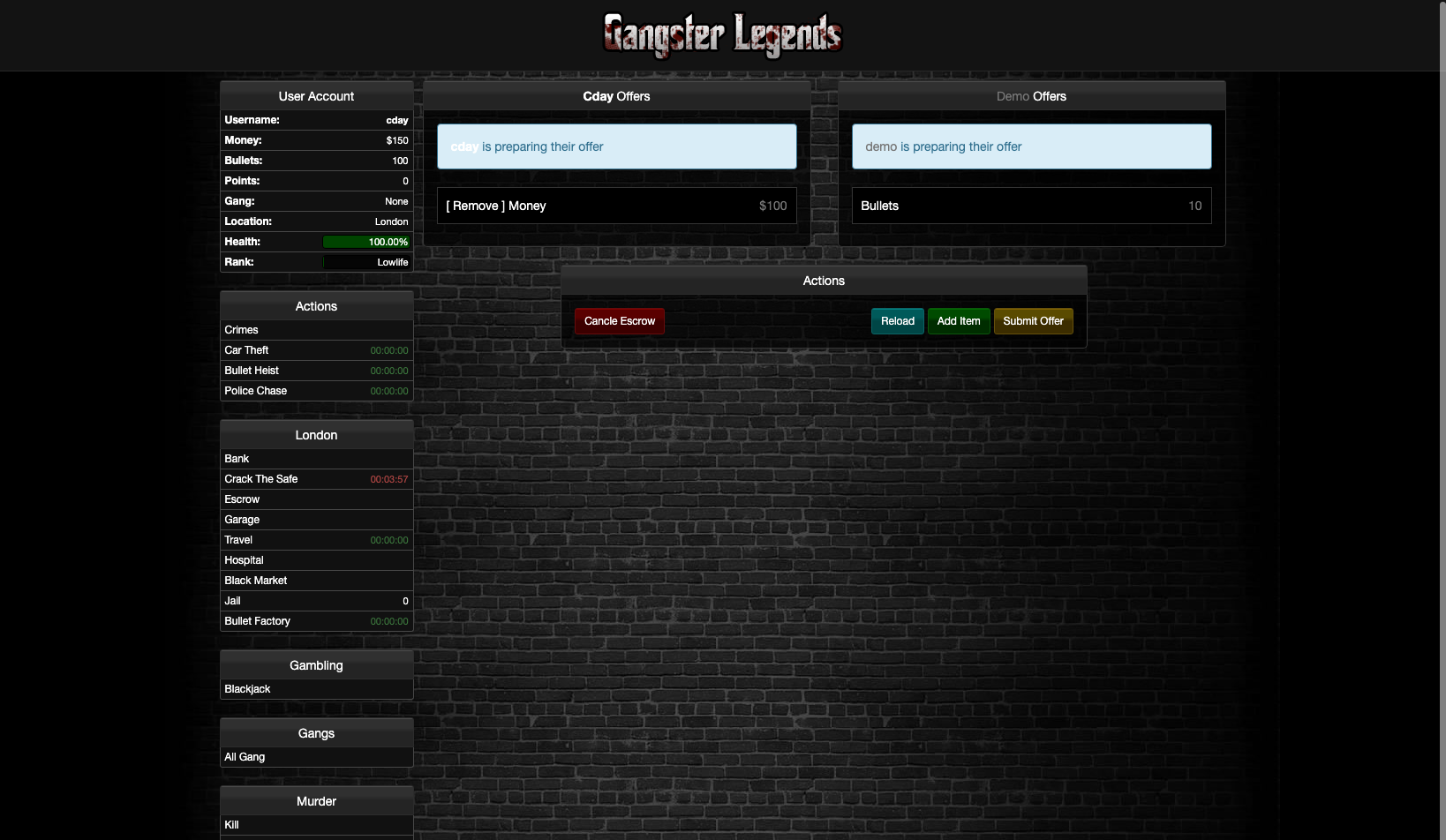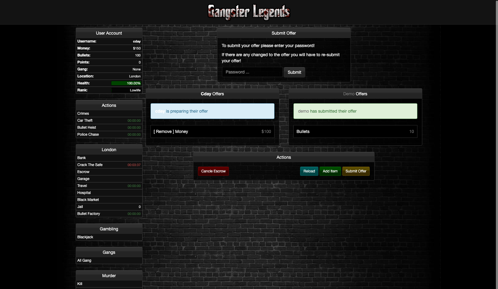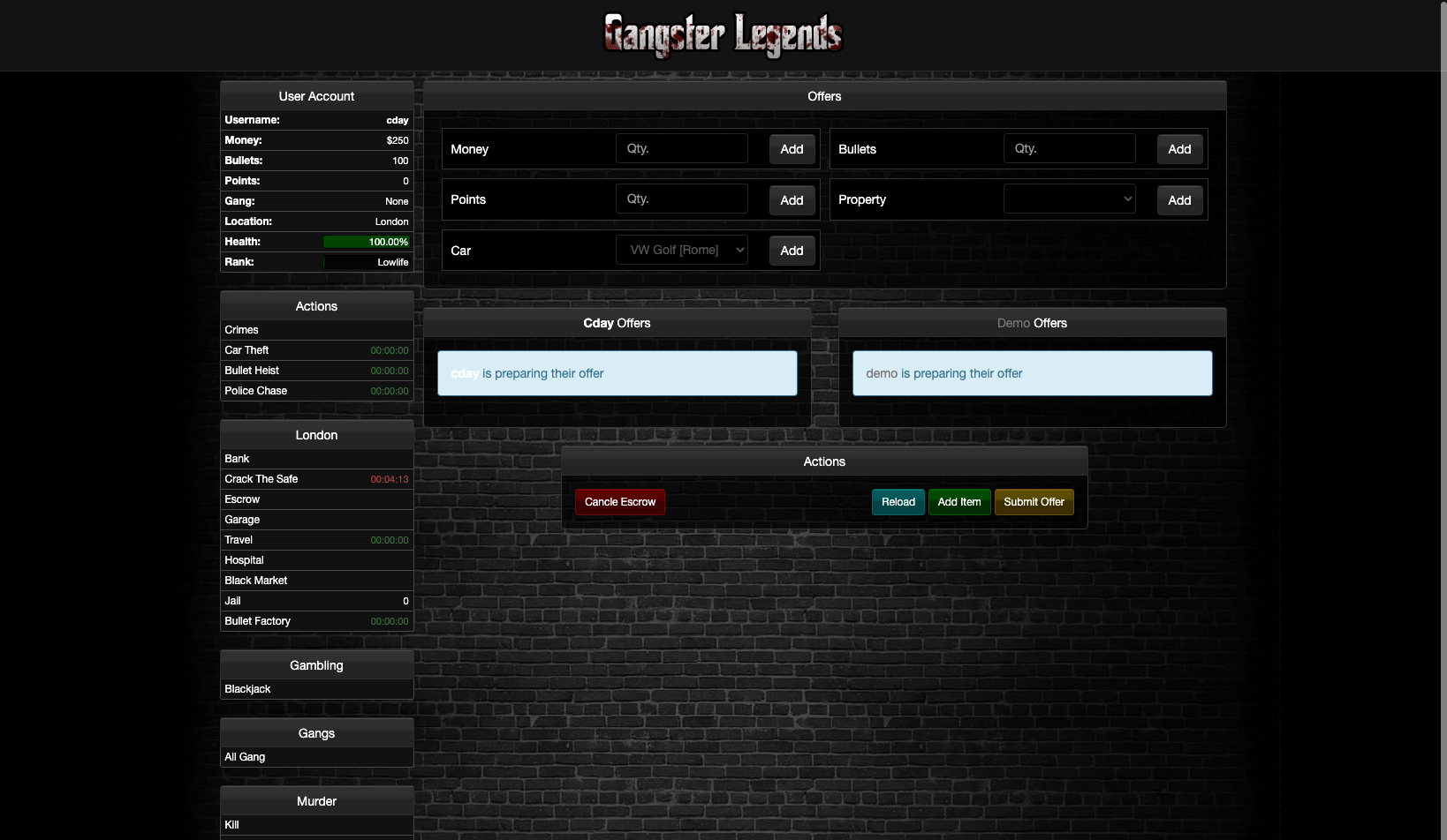 This allows people to trade Money, Points, Bullets, Cars and Properties with each other. Both parties have to agree on the deal by entering their password. Once agreed the items are transfrered.