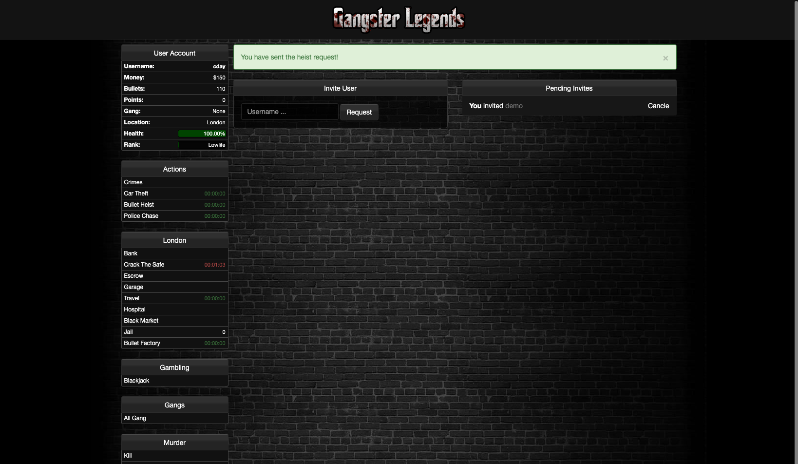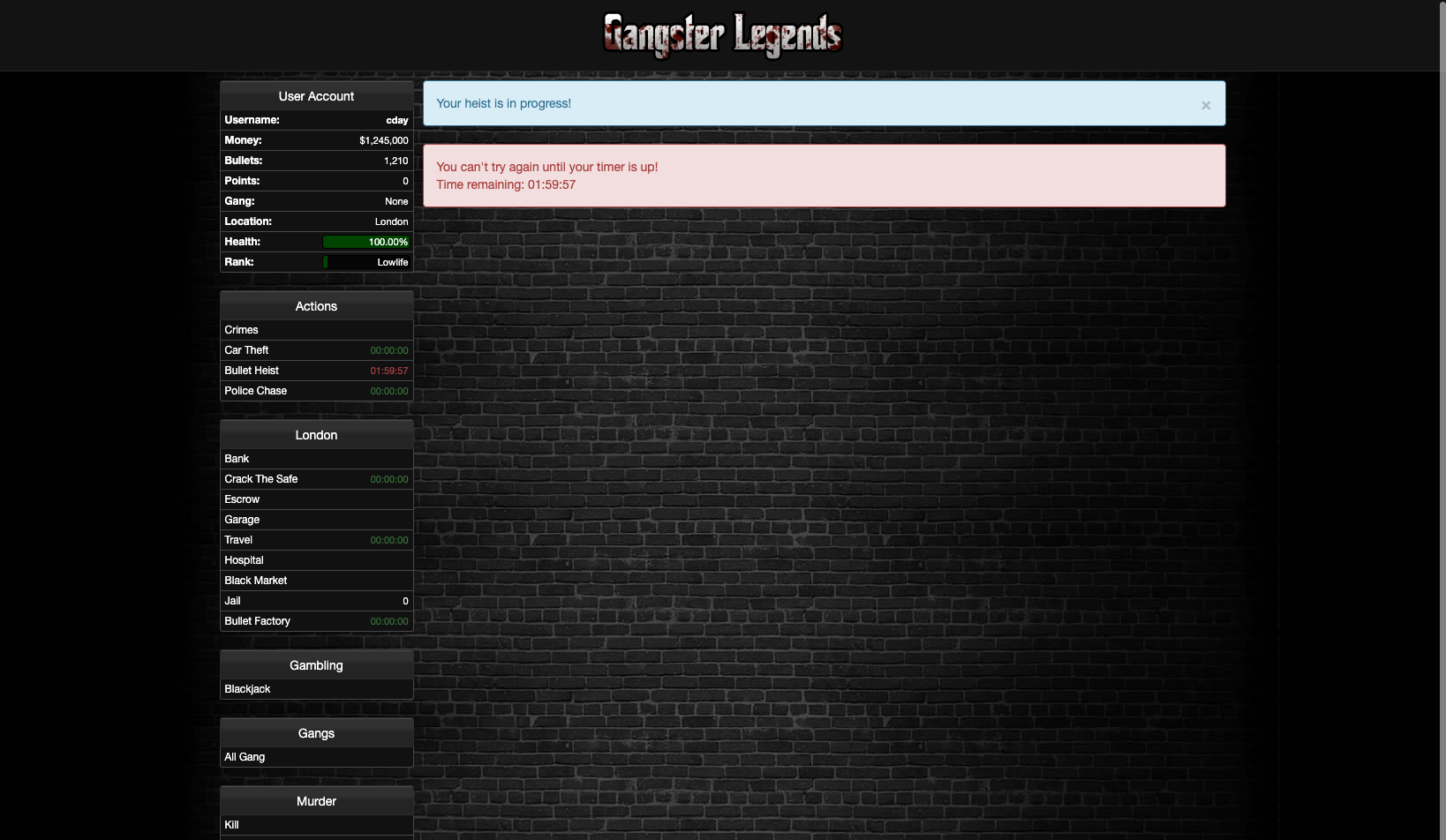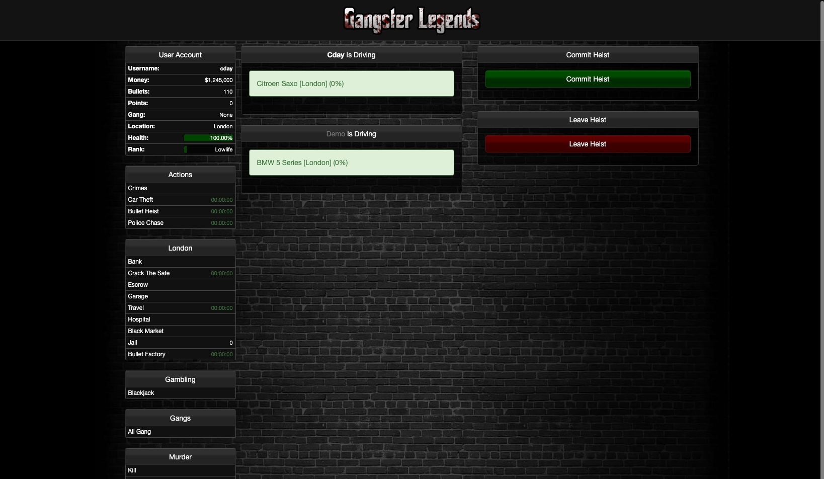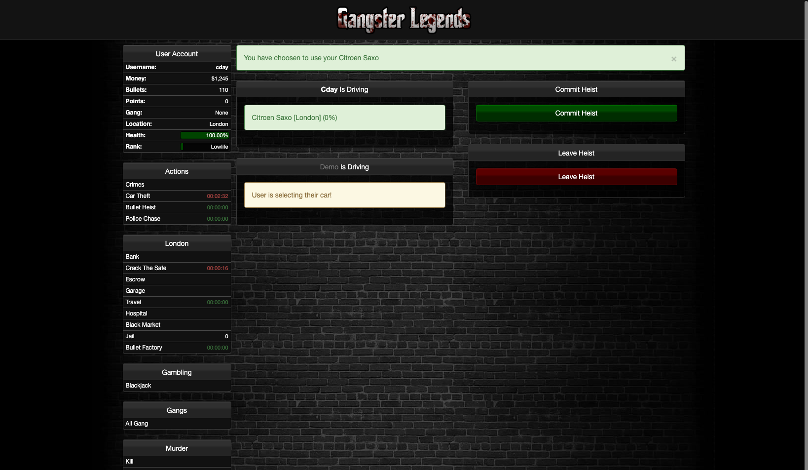 This module allows two users join together and select a car, once selected they commit the heist to win some bullets.
