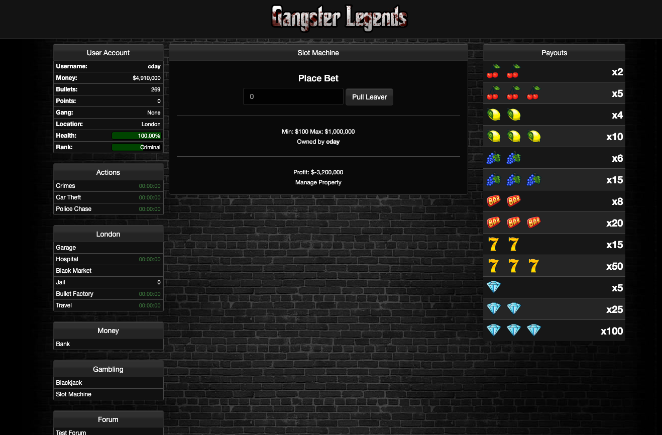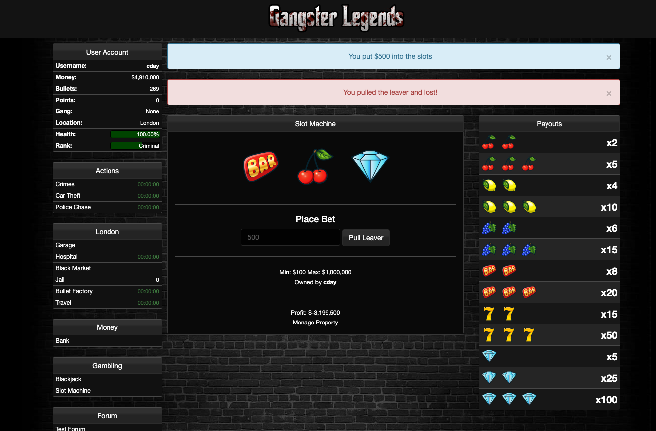 This is a very basic slot machine game users, can put money into the machine and pull the leaver. Depending on the output the slot machine pays out.